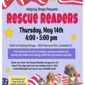 Join us for tons of fun at the May Rescue Readers event! Read to the shelter pets, tour the shelter, make crafts.