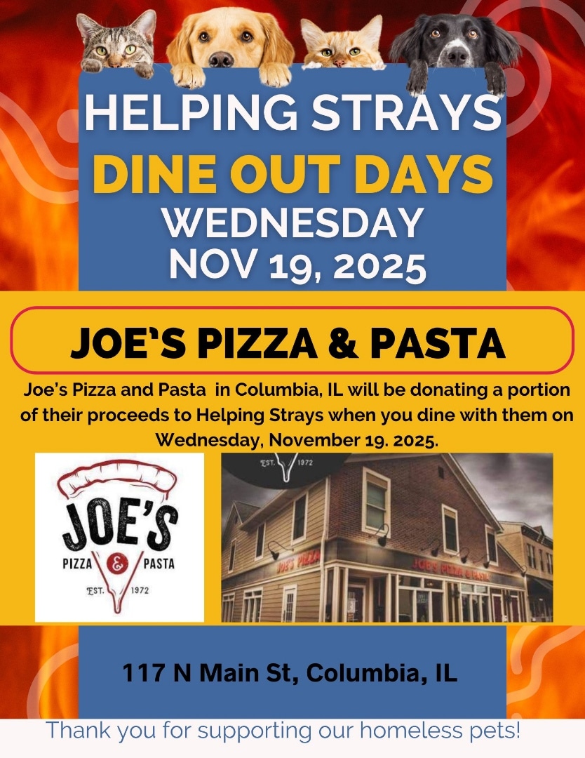Dine Out Days – Joe’s Pizza & Pasta Dine at Joe’s Pizza & Pasta in Columbia on Wednesday, November 19 where they will donate a portion of their proceeds to Helping Strays! + Add to Google Calendar + iCal / Outlook export 00 days 00 hours 00 minutes 00 seconds Date Nov 19 2025 Time 11:00 am - 9:00 pm Category Featured Fundraiser Shelter Events Share this event
