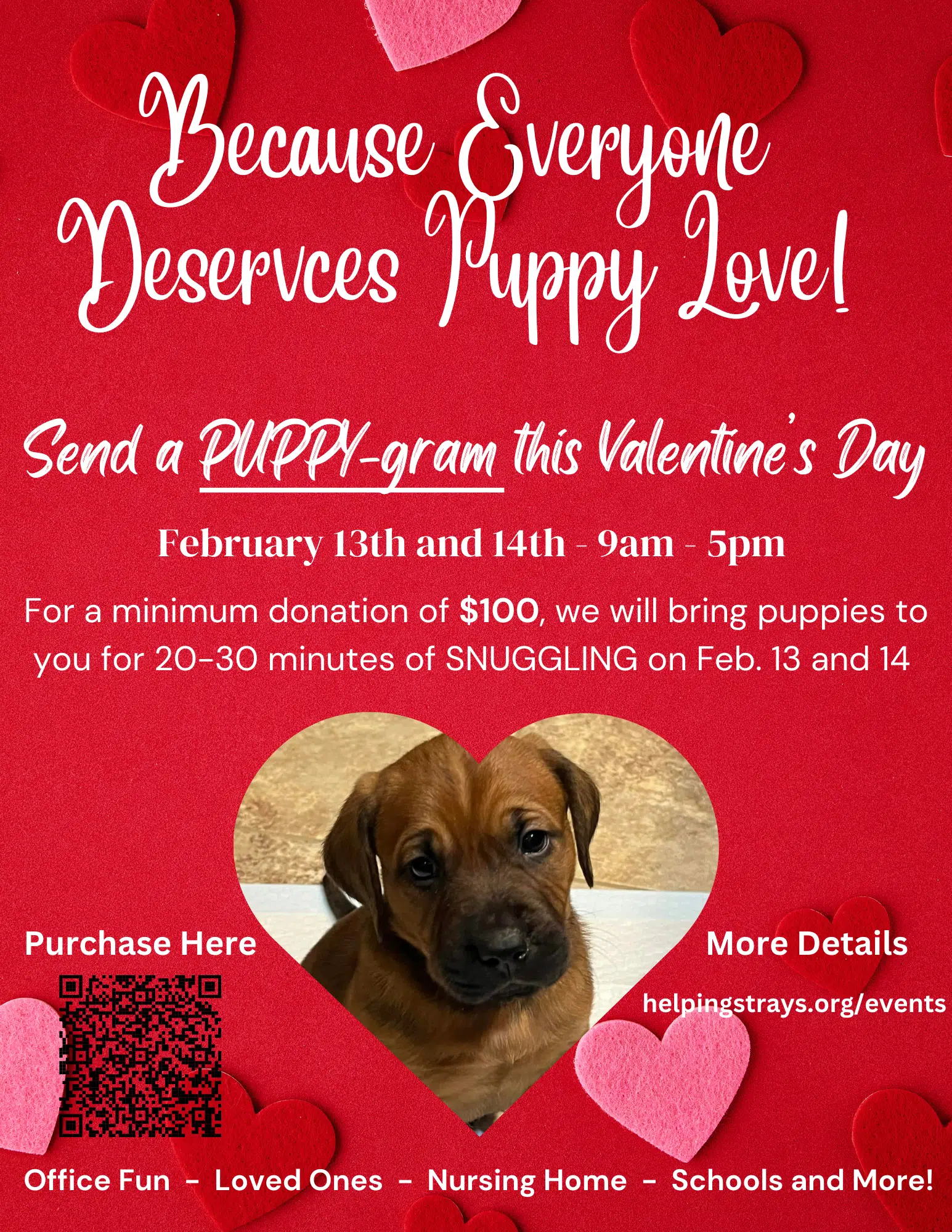 Puppy-Grams Surprise someone you love this Valentine’s Day with our Puppy-Grams! + Add to Google Calendar + iCal / Outlook export The event is finished. Date Feb 13 - 14 2025 Expired! Time 9:00 am - 5:00 pm Category Featured Fundraiser Shelter Events Share this event