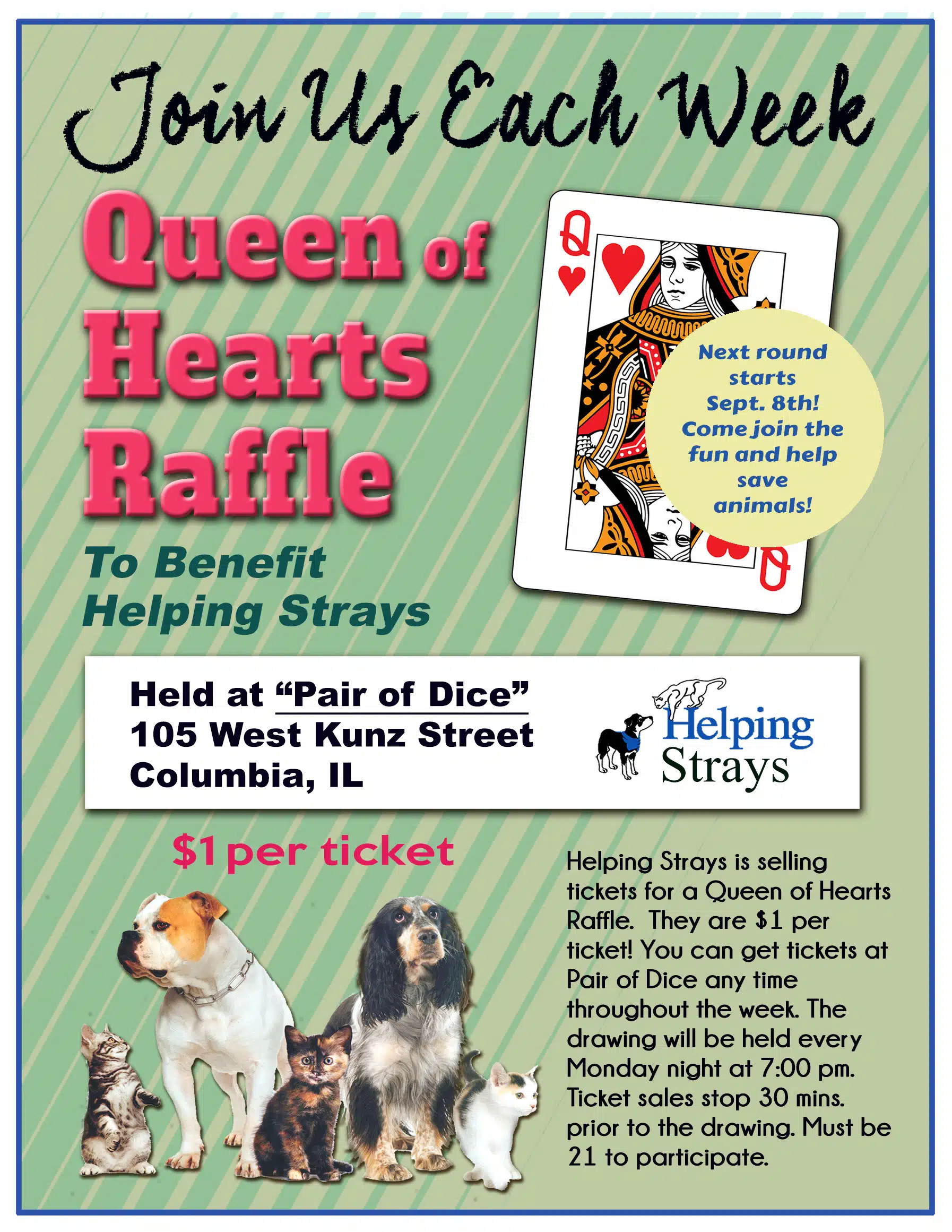 The Helping Strays Queen of Hearts drawing takes place every Monday at 7pm at Pair of Dice bar in Columbia, IL. Participants purchase tickets for a chance to win a growing jackpot while supporting a great cause. All proceeds go directly toward caring for homeless animals at Helping Strays.