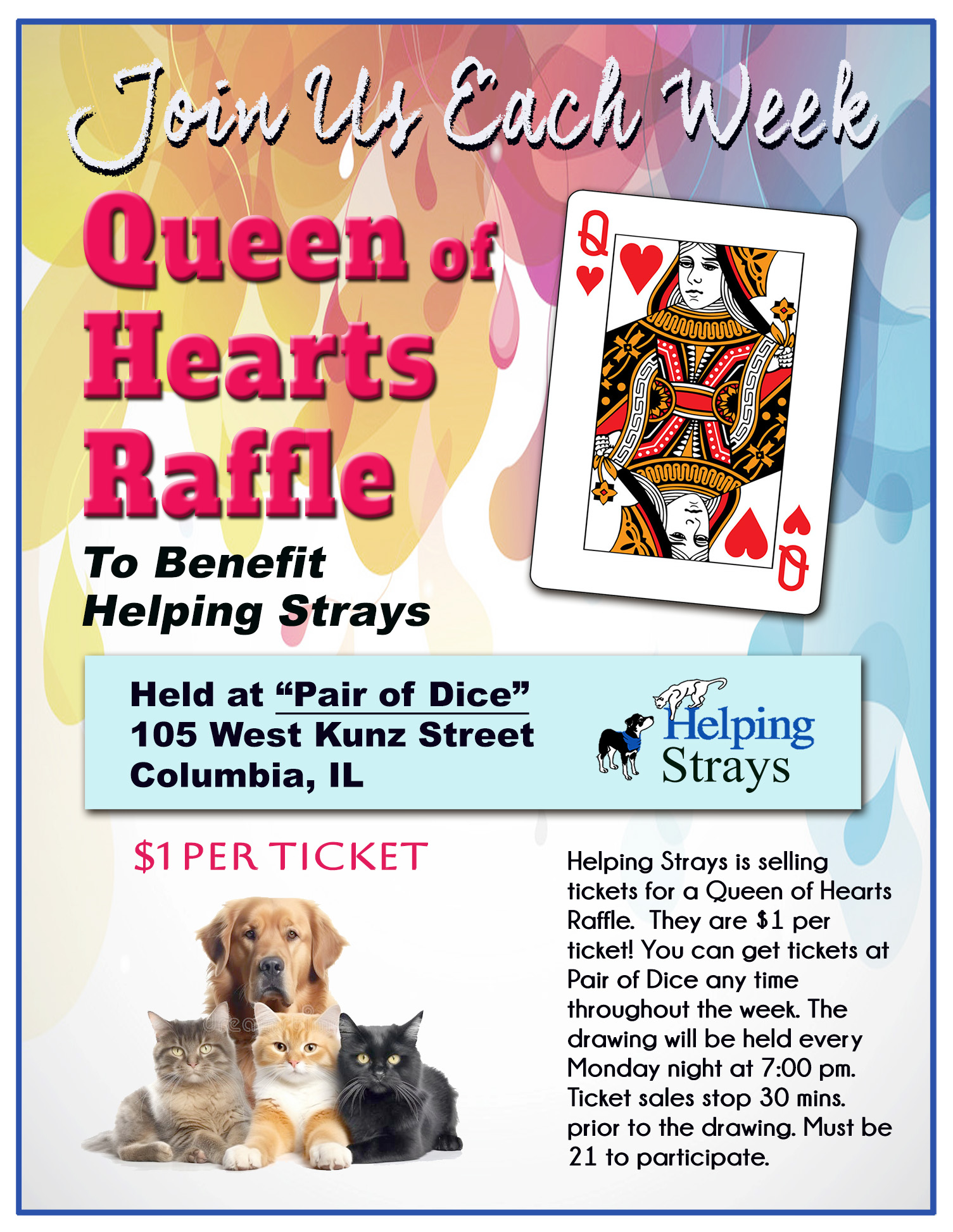 The Helping Strays Queen of Hearts drawing takes place every Monday at 7pm at Pair of Dice bar in Columbia, IL. Participants purchase tickets for a chance to win a growing jackpot while supporting a great cause. All proceeds go directly toward caring for homeless animals at Helping Strays.