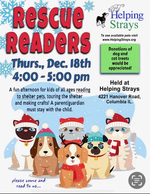 Rescue Readers! Join us for tons of fun at the December Rescue Readers event! + Add to Google Calendar + iCal / Outlook export 00 days 00 hours 00 minutes 00 seconds Date Dec 18 2025 Time 4:00 pm - 5:00 pm Category Featured Fundraiser Shelter Events Share this event