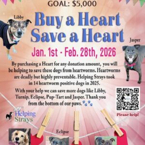 Purchase a heart for any donation amount and you will be helping cover the cost of expensive heartworm treatment for a shelter dog AND HELPING SAVE A LIFE. You can purchase a heart(s) at the following businesses: COLUMBIA: Birds Nest Design, Columbia Fit Body, Fabulous Finds, Fashion Attic, Helping Strays, Joe’s Pizza & Pasta, Khoury…